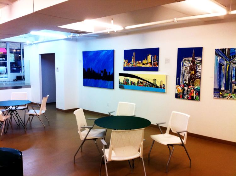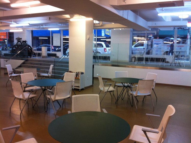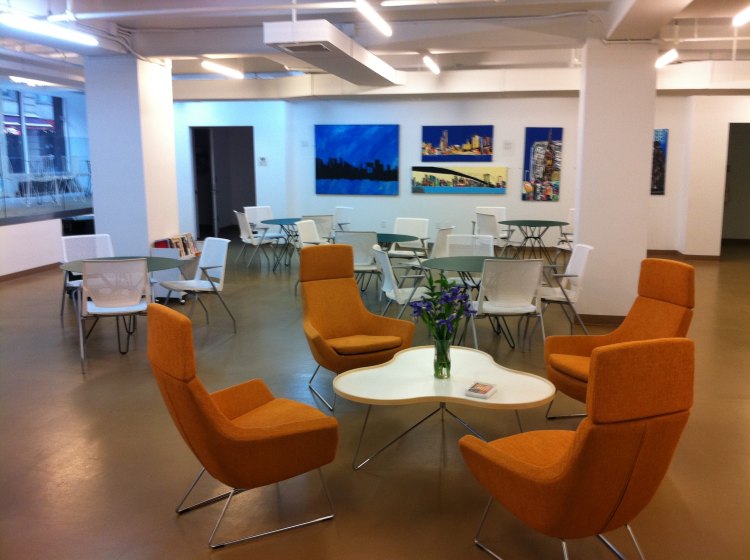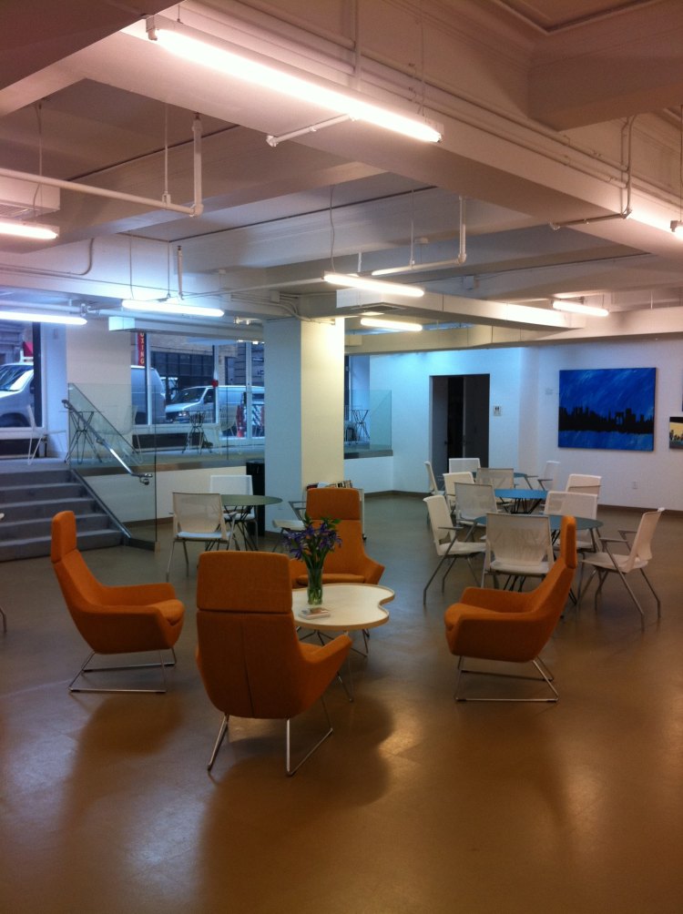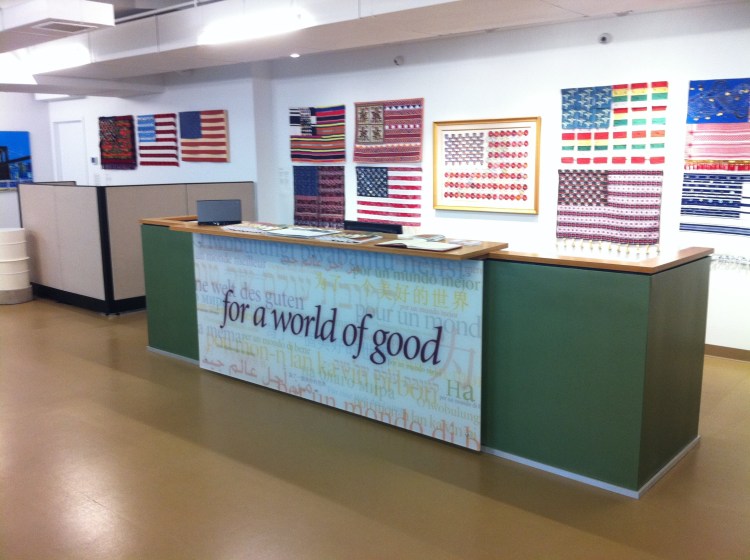 This community center is located near trinity church in downtown NYC. During the day it is used as a place for people to be able to do some work with free WiFi or to have a place to sit and eat lunch. At night they host activities and events such as fund raisers. this meant there furniture had to be durable to accommodate the daytime users while being light enough and stack-able for their nighttime events. They requested that there be a reception desk for the staff. We designed a custom desk with the words “for a world of good” layered in different languages.