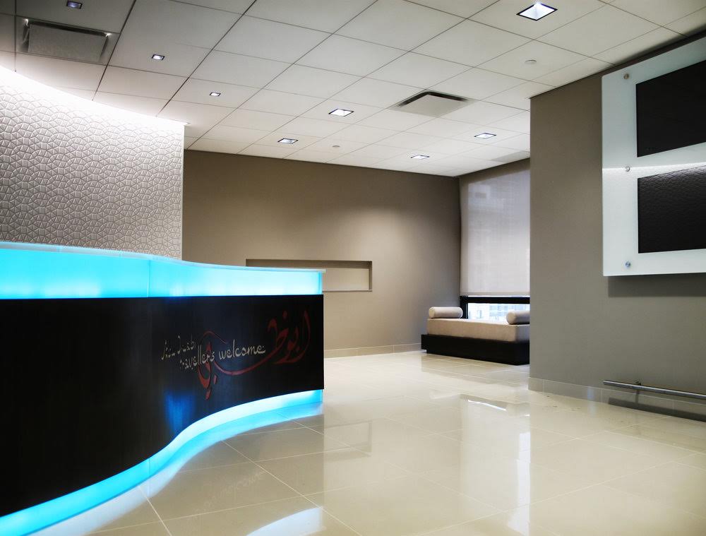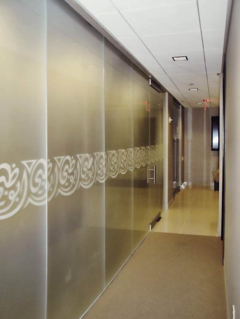 An Arabic Country’s Tourism Authority wanted to open a NYC office. We designed for them a space that would have a NY feel with hints to their traditional Moorish, Arabic, Design elements. The wall behind the reception is a custom designed custom cut curved wall. The furniture is a modern take upholstered in solid muted colors more suited to New York style. The glass walls used for the offices and conference room are clear when viewed straight on but obscured from any other view, their logo used as the safety decal along the way.