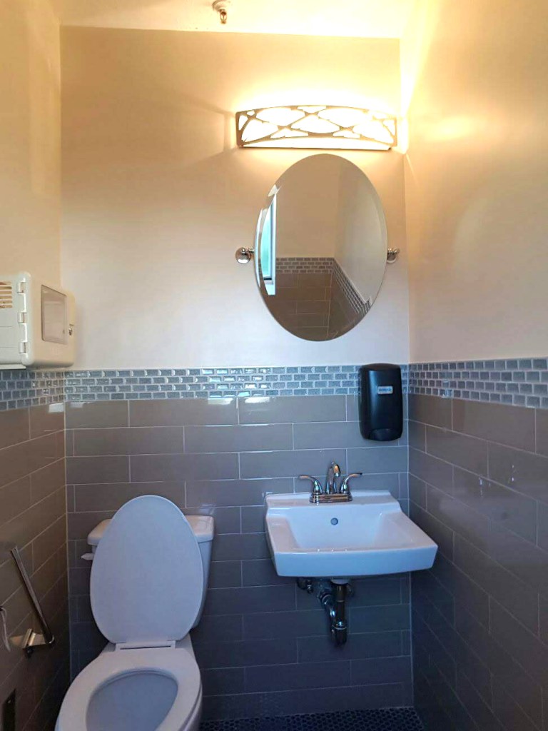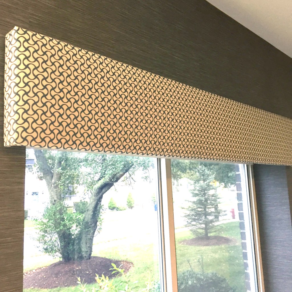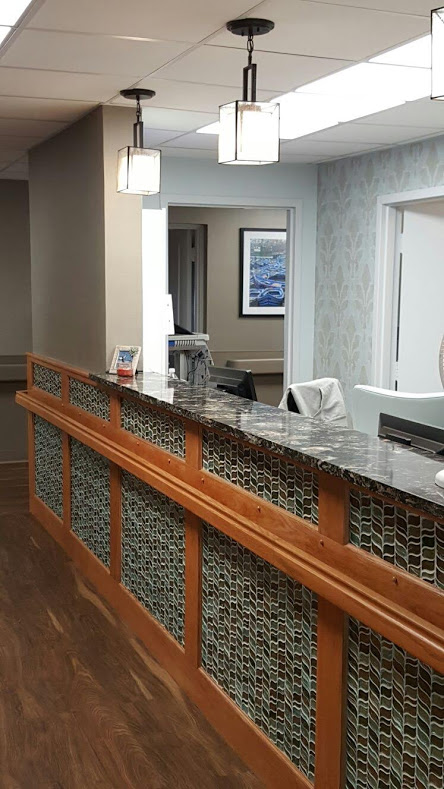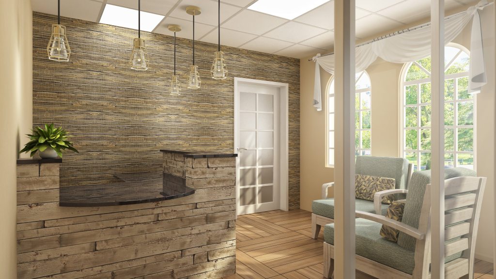 The reception desk was covered in a reclaimed wood like what would have been on an old ship. The lights above it were caged in metal like you would find on modern ships. The use of blues, wave like patterns & compass like patterns were used throughout in subtle ways. The artwork selected also fit within the design theme.