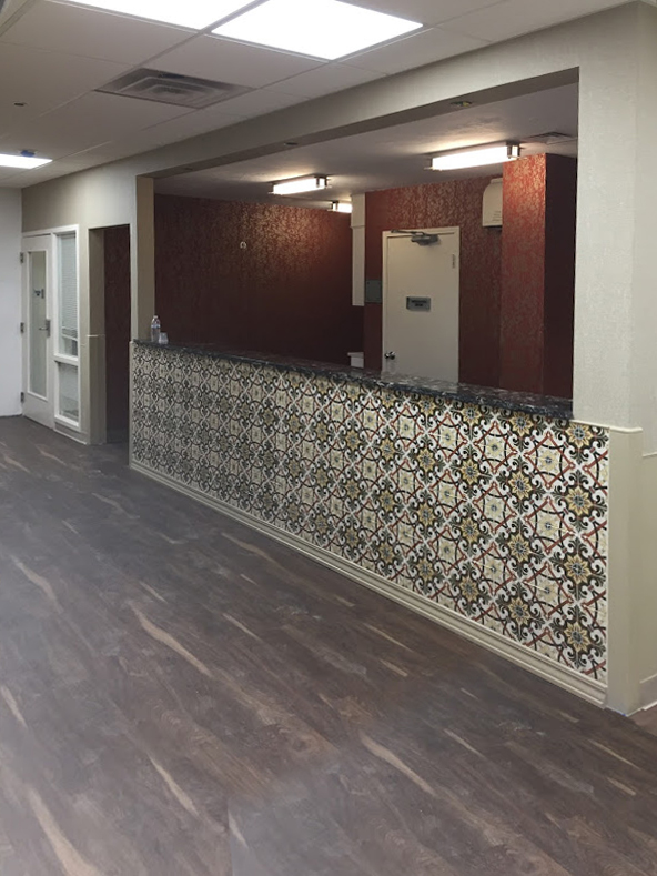 On the second floor they had a whole wing dedicated to their Portuguese population, with a nursing staff that spoke Portuguese. They asked us to keep the fishing/ boating theme since that is a big industry there as well. But to incorporate a more Portuguese feel. We used the bold colors of the flag and hand painted terracotta tiles to make the nurses station pop.