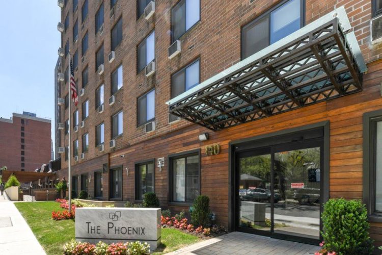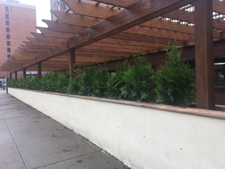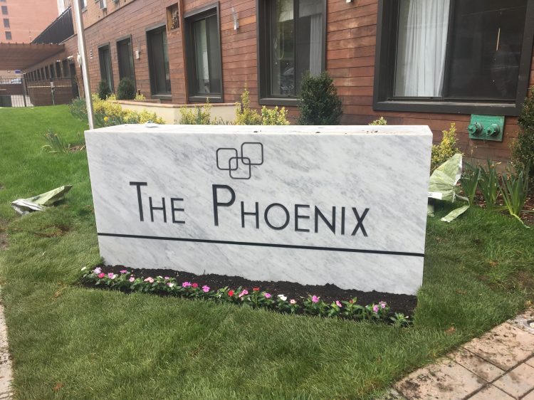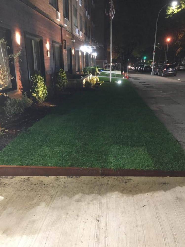 The entrance got a new awning and lighting. A flag pole surrounded by flowers was installed and evergreen shrubs line the facade.