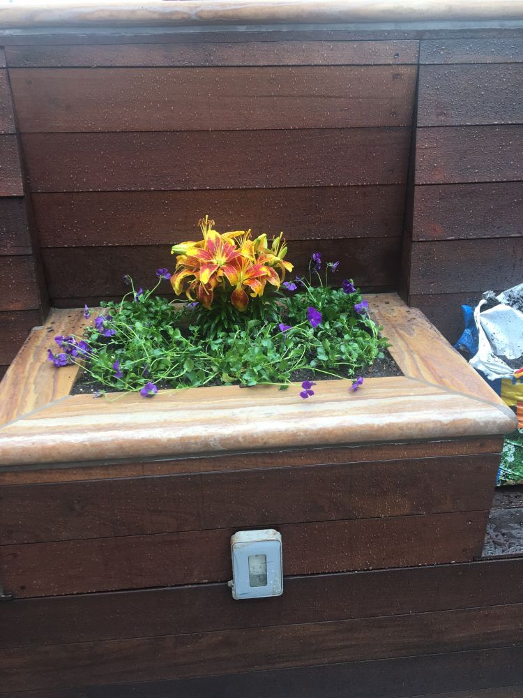 This healthcare facility needed an upgrade to their exterior. We proposed a wood ship-lap facade and a matching pergola with seating for the residents and their visitors. Evergreen trees give shade from the direct sunlight while perennial flowers bring beautiful color.